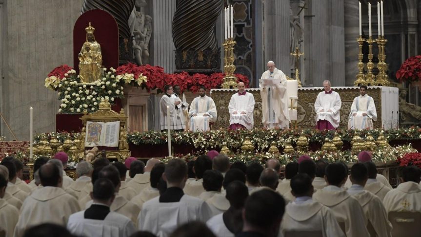 Paus Fransiskus mengatakan di dalam homilinya pada perayaan liturgi menyambut Tahun Baru di Basilika Santo Petrus bahwa kita perlu kagum dengan Maria, Bunda Allah, membiarkannya memandangi kita, merangkul kita dan memegang tangan kita.