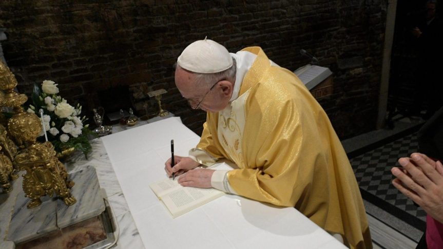 Paus Fransiskus menandatangani peringatan Seruan Apostolik Pasca-Sinodenya kepada orang-orang muda, yang berjudul “Kristus hidup”, selama kunjungan pastoral ke Loreto pada hari Senin.