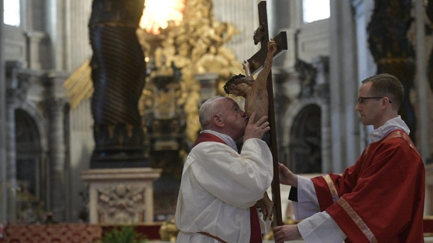Liturgi Sengsara Tuhan di Basilika Santo Petrus dipimpin oleh Paus Fransiskus. Pengkhotbah Rumah Tangga Kepausan, Pastor Raniero Cantalamessa, O.F.M.Cap, berkhotbah tentang bagian “Ia dihina dan ditolak oleh manusia”.