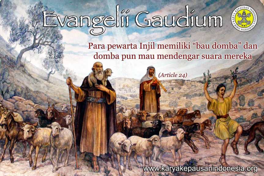 Dalam Seruan Apostoliknya, Evangelii Gaudium (Sukacita Injil), Paus Fransiskus mengatakan: Para pewarta Injil memiliki “bau domba” dan domba pun mau mendengar suara mereka. Maka, komunitas yang mewartakan Injil siap “menemani”. Menemani kemanusiaan dalam seluruh prosesnya, betapa pun sulit dan lamanya (Artikel 24).