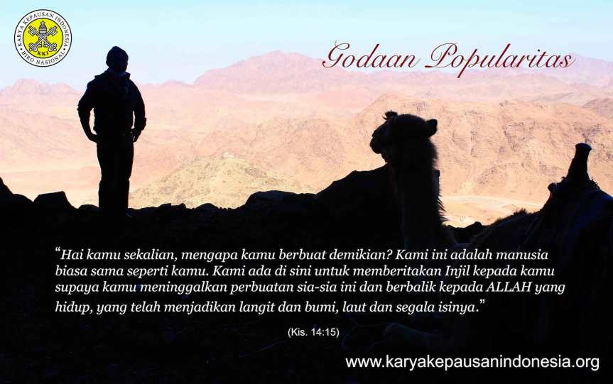Topik yang berkembang di kalangan pria bahkan tidak jarang juga seringkali menjadi perbincangan dan perhatian yang cukup serius di dalam pembinaan para calon imam mengenai godaan terbesar seorang pria. Godaan tersebut hanya tiga namun dapat menghancurkan hidup yaitu, kekuasaan, harta dan wanita. Saya tidak akan mencoba merefleksikan ketiga hal tersebut namun hanya satu poin saja yaitu kekuasaan. Kekuasaan ini sangat erat kaitannya dengan kehormatan, kedudukan dan popularitas. Di dalam bacaan hari ini ketika orang banyak melihat apa yang diperbuat oleh Paulus, orang-orang yang ada di Likaonia berseru, “Dewa-dewa telah turun ke tengah-tengah kita dalam rupa manusia”. Barnabas mereka sebut Zeus dan Paulus mereka sebut Hermes, karena ia yang berbicara. Mereka seketika diagungkan dan dielu-elukan oleh karena perbuatan mereka menyembuhkan orang yang lumpuh.