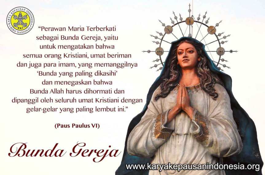 Paus Paulus VI menyatakan, “Perawan Maria Terberkati sebagai Bunda Gereja, yaitu untuk mengatakan bahwa semua orang Kristiani, umat beriman dan juga para imam, yang memanggilnya ‘Bunda yang paling dikasihi’ dan menegaskan bahwa Bunda Allah harus dihormati dan dipanggil oleh seluruh umat Kristiani dengan gelar-gelar yang paling lembut ini.”