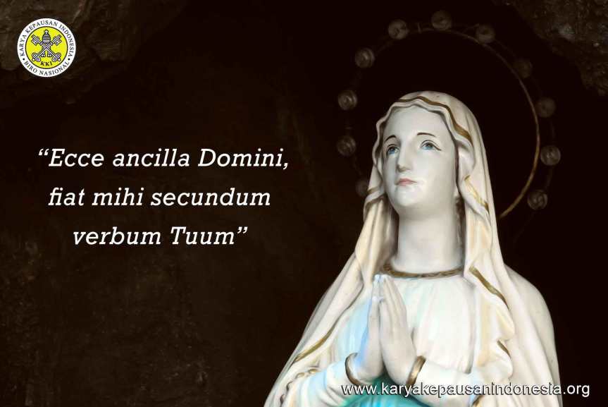 Bunda Maria adalah teladan dalam hal penyerahan diri dan iman pada Tuhan. Malaikat Gabriel datang kepada Maria, menyampaikan pesan bahwa ia akan mengandung dan melahirkan seorang anak laki-laki yang akan diberi nama Yesus. Sebagai seorang dara yang masih muda belia, belum bersuami tetapi dikatakan kepadanya ia akan mengandung dan melahirkan, jika tanpa iman percaya kepada Tuhan, mustahil Maria dapat berkata, Ecce ancilla Domini, fiat mihi secundum verbum Tuum (Luk.1:38).