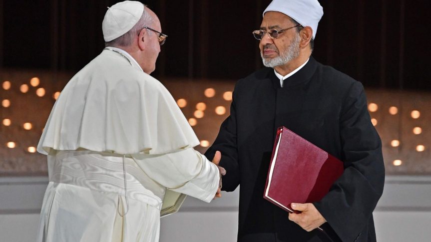 Paus Fransiskus dan Imam Besar Al-Azhar, Ahmed el-Tayyeb, menandatangani Dokumen Persaudaraan Manusia untuk Perdamaian Dunia dan Hidup Bersama di Abu Dhabi pada Februari 2019.