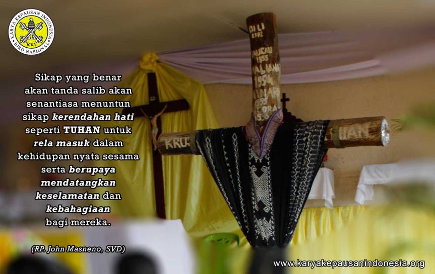 Mari kita mensyukuri karya agung Allah bagi kita ini dan semakin menumbuhkan komitmen serta semangat kita untuk mengikuti Tuhan termasuk dalam mengikuti salib-salib kehidupan kita. Kiranya tanda salib yang sering kita lakukan tiap hari tidak sekedar suatu aktus ritual kita sebagai orang Katolik tetapi menjadi suatu ekspresi iman kita akan spiritualitas Salib. Sikap yang benar akan tanda salib akan senantiasa menuntun sikap kerendahan hati seperti Tuhan untuk rela masuk dalam kehidupan nyata sesama serta berupaya mendatangkan keselamatan dan kebahagiaan bagi mereka.