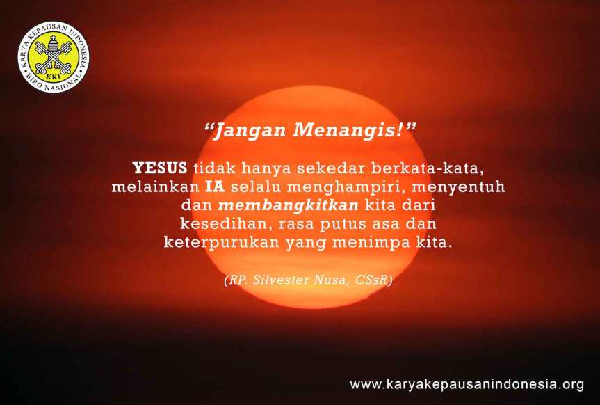 Apa makna kisah di atas bagi kita? Yang dialami oleh si janda juga dialami oleh setiap orang, termasuk kita. Tak ada orang yang dapat luput dari situasi demikian, situasi sedih tatkala orang yang kita cintai dan yang mencintai kita meninggal dunia. Perkataan Yesus “jangan menangis!” menjadi sumber kekuatan yang dapat membebaskan kita dari rasa sedih dan pedih. Memang, orang yang meninggal tak akan bangun, duduk dan berkata-kata sebagaimana anak laki-laki si janda. Namun, Yesus adalah kebangkitan dan hidup. “Akulah kebangkitan dan hidup; barangsiapa percaya kepada-Ku, ia akan hidup walaupun ia sudah mati” (Yoh. 11:25). Kuasa perkataan Yesus “jangan menangis” tidak hanya berlaku dan berdaya pada peristiwa kematian, melainkan juga dalam situasi ketika kita mengalami berbagai tantangan, kesulitan, cobaan dan penderitaan karena iman kita akan Yesus. Dalam situasi seperti itu, kata-kata Yesus “jangan menangis” akan menjadi sumber kekuatan karena Yesus tidak hanya sekedar berkata-kata, melainkan Ia selalu menghampiri, menyentuh dan membangkitkan kita dari kesedihan, rasa putus asa dan keterpurukan yang menimpa kita. Kita percaya bahwa Yesus yang tergerak hati-Nya oleh belas kasihan ketika menyaksikan kesusahan si janda, juga senantiasa tergerak hati-Nya oleh belas kasihan saat Ia menyaksikan kesusahan dan kesedihan setiap orang (kita) yang percaya kepada-Nya. Semoga kita pun senantiasa “mengusung” segala kesedihan dan kesusahan kita sendiri dan “mengusung” saudara-saudari yang sedang berkesusahan kepada Yesus, Sang Nabi Besar yang senantiasa hadir di tengah-tengah kita. Jadi, jangan menangis!