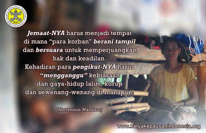 Janda adalah simbol manusia lemah. Posisinya rentan dalam masyakat yang dominan pria. Ketiadaan suami berarti kehilangan pembela dan sandaran. Tampaknya juga tidak ada anak yang memperjuangkan nasibnya. Ia berjuang sendirian. Hukum Taurat menuntut perlindungan terhadap janda, anak yatim dan orang asing (Kel. 22:22; Ul. 10:14-19). Akan tetapi, apalah artinya rumusan hukum di tangan hakim yang lalim dan tidak peduli? Di titik inilah muncul kejutan. Ternyata, janda ini bukanlah tipe manusia yang diam saja menerima nasibnya. Ia juga tidak mau menyuap untuk menangkan perkara. Dia yang lazimnya menjadi korban para pria, pejabat dan penguasa, justru tampil ngotot dan perkasa. Dia yang biasanya membisu, ternyata tampil tanpa ragu dan berulang-ulang meneriakkan haknya. Ia menantang kuasa dan kesewenangan. Kehadirannya mengganggu kenyamanan penguasa. Cerita Yesus ini membalikkan stereotip janda sebagai pihak yang lemah, diam dan tidak berdaya. Itulah pesan pertama: Yesus mengajak kita untuk masuk dalam cara pandang baru: cara melihat Allah, dunia, manusia, dan diri sendiri secara baru. Jemaat-Nya harus menjadi tempat di mana “para korban” berani tampil dan bersuara untuk memperjuangkan hak dan keadilan. Kehadiran para pengikut-Nya harus “mengganggu” kebiasaan dan gaya-hidup lalim, korup dan sewenang-wenang di manapun!