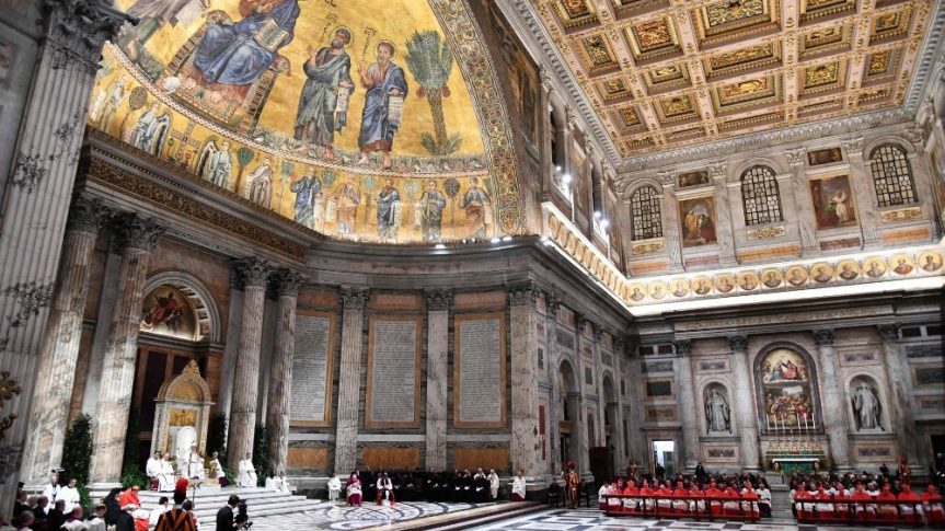Paduan Suara Kapel Sistine Vatikan dan Paduan Suara Biarawan Benediktin bernyanyi pada pelayanan di Basilika Santo Paulus di luar Tembok yang secara tradisional jatuh pada Hari Pertobatan Santo Paulus.