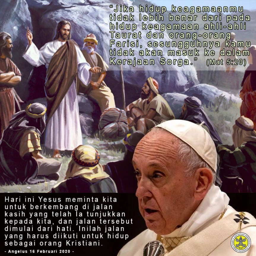 Bacaan Injil hari ini (Mat. 5:17-37) diambil dari “Khotbah di Bukit”, dan membahas alasan penggenapan hukum: bagaimana aku harus mematuhi hukum, apa yang harus kulakukan. Yesus ingin membantu para pendengar-Nya untuk memiliki pendekatan yang benar terhadap ketetapan perintah-perintah yang diberikan kepada Musa, menasihati mereka agar tersedia bagi Allah yang mendidik kita menuju kebebasan dan tanggung jawab sejati melalui hukum. Berkenaan dengan menjalaninya sebagai alat kebebasan. Jangan melupakan hal ini: menjalankan hukum sebagai alat kebebasan, yang membantuku untuk menjadi semakin bebas, yang membantuku untuk tidak menjadi budak hawa nafsu dan dosa. Kita memikirkan peperangan, kita memikirkan akibat peperangan, kita memikirkan anak yang meninggal karena kedinginan di Suriah kemarin lusa itu – begitu banyak bencana, begitu banyak. Inilah buah dari hawa nafsu dan orang-orang yang berperang tidak tahu bagaimana mengendalikan hawa nafsu. Mereka gagal menggenapi hukum. Ketika kita menyerah terhadap godaan dan hawa nafsu, kita bukan empunya dan pelaku utama dalam kehidupan kita tetapi menjadi tidak mampu mengelolanya dengan tekad dan tanggung jawab.