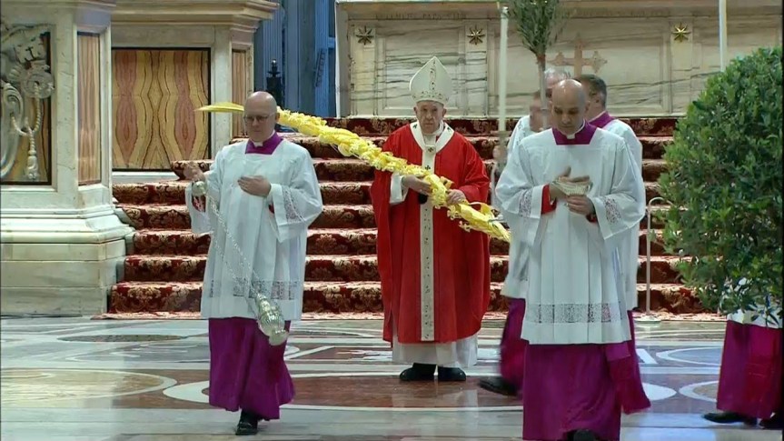 Yesus “telah mengosongkan diri-Nya sendiri, dan mengambil rupa seorang hamba” (Flp. 2:7). Marilah kita memperkenankan kata-kata Rasul Paulus ini menuntun kita ke dalam hari-hari suci ini, ketika sabda Allah, seperti sebuah pengulangan, menghadirkan Yesus sebagai hamba: pada hari Kamis Putih, Ia digambarkan sebagai hamba yang membasuh kaki murid-murid-Nya; pada hari Jumat Agung, Ia ditampilkan sebagai hamba yang sedang menderita dan jaya (bdk. Yes 52:13); dan besok kita akan mendengar nubuat Yesaya tentang Dia: “Lihat, itu hamba-Ku yang Kupegang” (Yes 42:1). Allah menyelamatkan kita dengan melayani kita. Kita sering berpikir bahwa kitalah yang melayani Allah. Tidak, Ialah yang dengan sukarela memilih untuk melayani kita, karena Ia terlebih dahulu mengasihi kita. Sulitnya mengasihi dan tidak dikasihi sebagai imbalannya. Dan bahkan lebih sulit untuk melayani jika kita tidak memperkenankan diri kita dilayani oleh Allah.