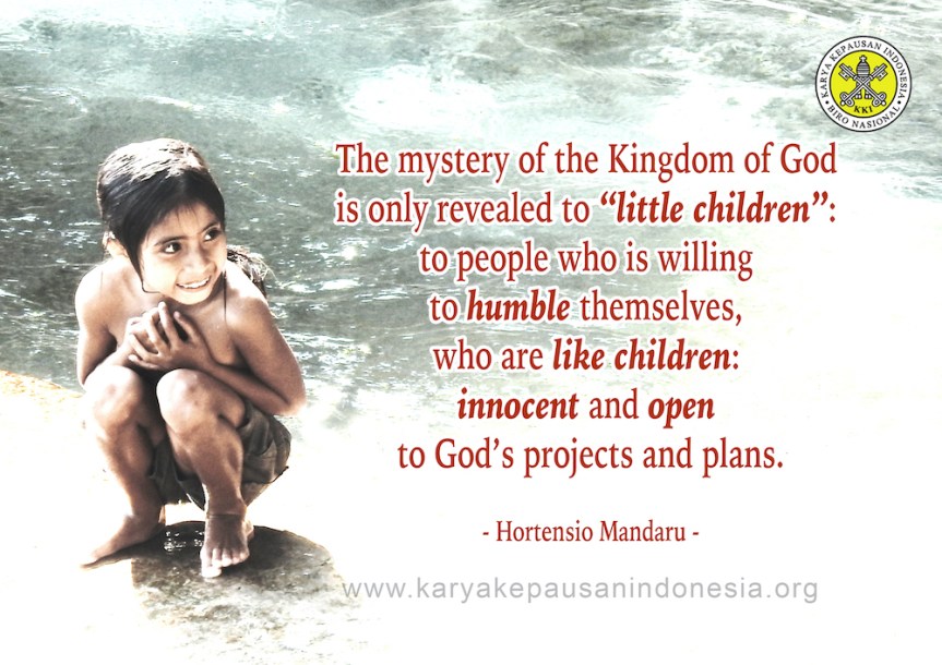 God reveals Himself in various religions. What is the special trait of God’s revelation through Jesus? Today Jesus teaches us about that. The mystery of the Kingdom of God is only revealed to “little children”: to people who are willing to humble themselves, who are like children: innocent and open to God’s projects and plans. The mystery will be hidden from the “wise and clever”: the Pharisees and the Scribes, both past and present. Those who are ambitious, who pretend to know God’s plan, do not see that God’s plan is being realized in and through Jesus. The Pharisees and the Scribes prided themselves as the clever and the ones who know God’s Law (Old Testament), but they failed to catch the essence of the Law: justice, compassion and loyalty (Matt. 23:23). They always rejected Jesus, plotted against God’s plans and projects that He was presenting.