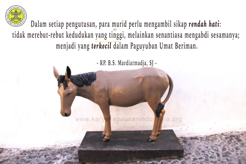 BACAAN INJIL – Matius 20:20-28: Para murid Kristus, dapat saja mempunyai ambisi yang besar sekali, dan karena itu menginginkan untuk bekerja bagi Tuhan. Namun Tuhan mengingatkan berkali-kali, bahwa Bapa lah yang menentukan pengutusan mereka. Mungkin sekali, para utusan itu mampu memikul beban yang amat berat, namun senantiasa perlu disadari, bahwa kekuatan Allah yang meneguhkan mereka. Oleh sebab itu, dalam setiap pengutusan, para murid perlu mengambil sikap rendah hati: tidak merebut-rebut kedudukan yang tinggi, melainkan senantiasa mengabdi sesamanya; menjadi yang terkecil dalam Paguyuban Umat Beriman.