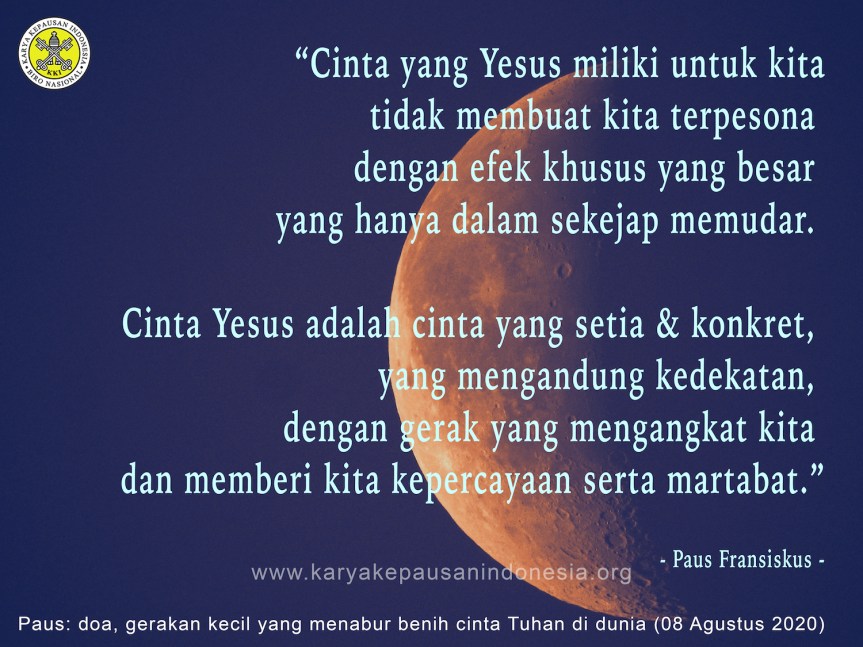 MQ: Pesan Paus Fransiskus Bagikan ini: Bagikan pada Facebook(Membuka di jendela yang baru) Facebook Lagi Bagikan ke X(Membuka di jendela yang baru) X Bagikan ke WhatsApp(Membuka di jendela yang baru) WhatsApp Kirim email tautan ke teman(Membuka di jendela yang baru) Surat elektronik Suka Memuat... Terkait