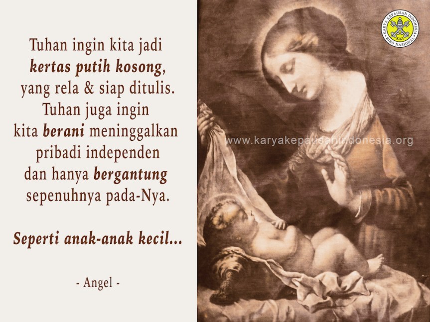 Yesus katakan, “Sebab orang-orang seperti merekalah yang empunya Kerajaan Surga.” Mau memiliki surga? Jadilah orang-orang seperti anak-anak: polos dan tergantung. Sebenarnya karateristik ini dulu juga ada pada diri kita semua yang pernah menjadi “anak-anak”. Namun, sejalan waktu, bertumbuh dan hidup dalam dunia, karateristik itu pun pudar, tak menyisakan bekas di dalam diri kita. Kita bukan lagi kertas putih, kita telah penuh dengan coretan dan warna. Kemudian kita juga diajarkan dan sering kali dituntut baik oleh pihak lain maupun situasi untuk menjadi individu-individu yang independen, kuat, tidak membutuhkan orang lain. Semakin mapan kehidupan kita, semakin kita merasa aman, karena lepas dari ketergantungan pada sekitar.