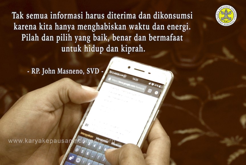 Salam jumpa lagi melalui temu berhikmah di Selasa V bulan Agustus ini. Kita diajak merenungkan pesan Sabda Tuhan hari ini yang sangat aktual dengan situasi kita zaman sekarang di mana kita ‘dihujani aneka pengetahuan dan informarsi. Apa yang perlu kita lakukan menghadapi situasi ‘hujan informasi’ tersebut: