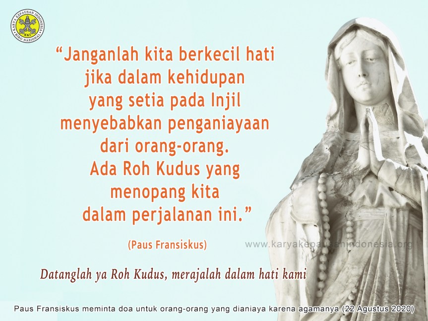 Bersama Santa Maria, Bunda Yesus dan Bunda Gereja, secara khusus aku berdoa bagi ujud-ujud Bapa Suci dan para rasul doa Gereja Indonesia untuk bulan ini: