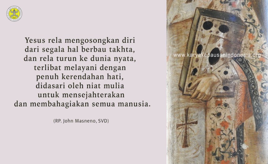 “Hendaklah kamu dalam hidupmu bersama, menaruh pikiran dan perasaan yang terdapat juga dalam Kristus Yesus, yang walaupun dalam rupa Allah, tidak menganggap kesetaraan dengan Allah itu sebagai milik yang harus dipertahankan, melainkan telah mengosongkan diri-Nya sendiri, dan mengambil rupa seorang hamba, dan menjadi sama dengan manusia” (Filipi 2: 5-7).