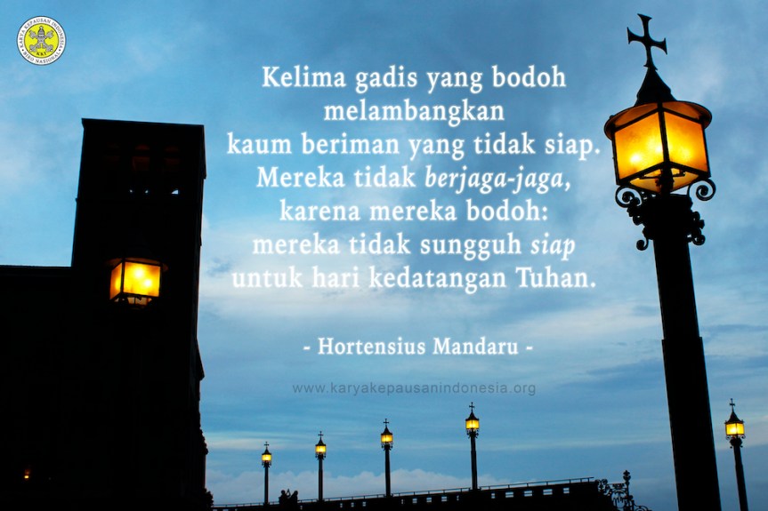 Third, the five foolish virgins represent the unprepared believers. They are not alert, not because they fall asleep (the five wise virgins are also asleep!) but because they are foolish: they are not really ready for the day of the Lord’s coming. When Christ’s coming is delayed, they run out of oil. Their faith flares only at the beginning of repentance, but then fades and extinguishes in the long journey and struggle of life. When the Lord finally comes, they aren’t prepared. Eventhough they are eventually managed to buy the oil, they are still late. The door of the heavenly feast are tightly closed. The plea of “Lord, Lord…” does not make them known by the Lord. The door of Heaven is not opened by words, but by doing God’s words along the journey of life.