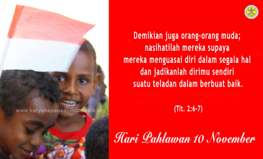 Salam jumpa lagi melalui renungan KKI ini di hari Selasa 10 November 2020 ini yang merupakan Hari Pahlawan Nasional. Tentunya menjadi suatu momentum yang baik bagi kita guna menimba semangat kepahlawanan dari para pahlawan demi menunaikan tugas-tugas kita. Dari kacamata iman, kita bisa menggunakan momen ini sebagai kesempatan kita meningkatkan semangat hidup kita sebagai misionaris-misionaris Allah. Karena sejak dibaptis kita mulai mengemban tugas misi Allah dalam diri kita.