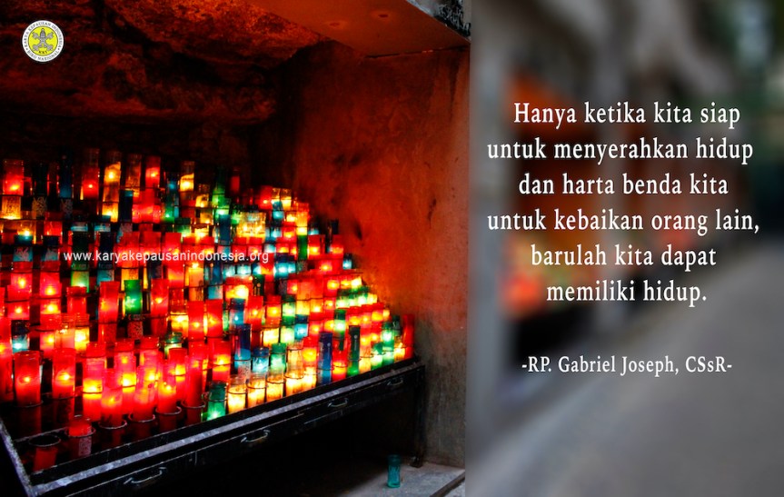 Kita tidak tahu kapan waktunya akan tiba bagi kita untuk bertemu dengan Tuhan. Ketika saatnya tiba, tidak ada apapun yang dapat kita bawa dari dunia ini bersama kita. Baik itu orang yang kita cintai maupun harta benda. Kepemilikan kita hanyalah sementara, semuanya hanya dalam status pinjaman. Saat kita mati, semuanya akan ditinggalkan! Inilah juga yang Tuhan maksudkan dengan perkataan-Nya, “Barangsiapa pada hari itu sedang di peranginan di atas rumah, dan barang-barangnya ada di dalam rumah, janganlah ia turun untuk mengambilnya, dan demikian juga orang yang sedang di ladang, janganlah ia kembali. Ingatlah akan istri Lot! Barangsiapa berusaha memelihara nyawanya, ia akan kehilangan nyawanya, dan barangsiapa kehilangan nyawanya, ia akan menyelamatkannya,” (Luk. 17:31-33). Yesus juga berkata, “Apa gunanya seorang memperoleh seluruh dunia tetapi kehilangan nyawanya? Dan apakah yang dapat diberikannya sebagai ganti nyawanya?” (Mat. 16:26). Ini adalah pertanyaan mendasar yang perlu kita tanyakan pada diri kita sendiri; jangan sampai di akhir hidup, kita tidak hanya mendapati diri kita tidak siap untuk meninggalkan dunia, tetapi juga baru menyadari bahwa kita telah hidup dengan sia-sia. Jika kita bersama Tuhan, kita akan menyadari semua hal duniawi ini, meskipun pada hakikatnya baik, sifatnya hanya sesaat, untuk memberi kita hiburan saat kita menjalani ziarah kehidupan menuju ke surga. Yesus mengingatkan bahwa, kita tidak boleh membiarkan harta benda menghalangi kita untuk mencintai dan memberikan diri kita sendiri kepada satu sama lain untuk memperoleh hidup. Hanya ketika kita siap untuk menyerahkan hidup kita dan harta benda kita untuk kebaikan orang lain, barulah kita dapat memiliki hidup. Inilah ironi hidup. Dengan memberikan apa yang kita miliki, kita menemukan cinta dan kegembiraan.