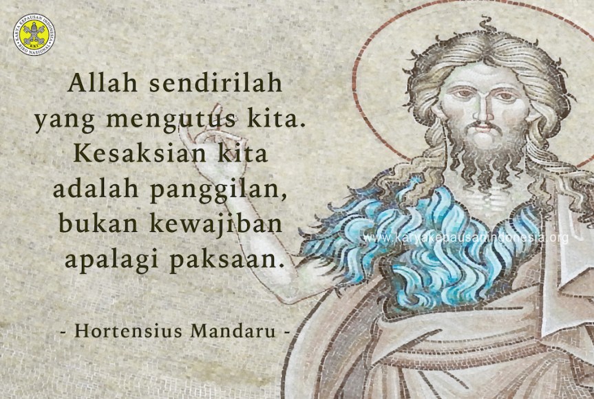 It is not easy to talk about “witness” in our world. Today’s witness can be easily bought, easily become a means for transaction. False witnesses and testimonies can imprison honest people who do not corrupt. Therefore, it is approriate to reflect on the quality of John as a true witness of Christ. First, being a witness is a mission or a calling from God. John is a witness “who is sent by God” (v. 6). His mission “comes from Heaven” (cf. Mrk. 11:30). Today he is presented with the delegates of the Religious Court. Two different “missionary” qualities. One conveys the message of God, the other conveys the message of the scholars. John works on calling, the other works by order. Advent makes us realize the root of our calling as Christ’s witness: God Himself sends us. We bear witness not for other motivation, but as a calling, not an obligation nor compulsory.