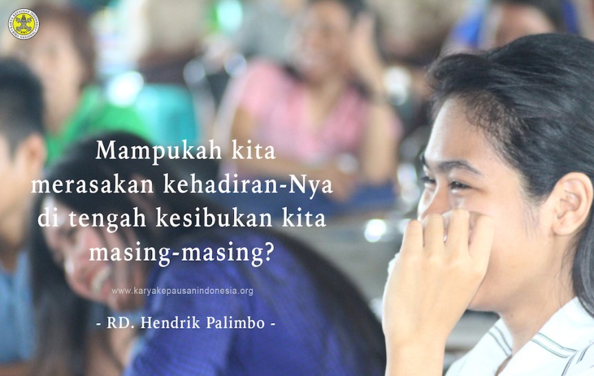 Setiap pagi saya merasakan kehadiran Allah secara sederhana melalui kasih-Nya dari orang lain. Melalui ibu bagian dapur pastoran yang setiap pagi menyiapkan jus segar dan makanan sehat dengan sangat baik saya maknai sebagai bentuk kehadiran Kasih Allah melalui orang lain. Di kampus tempat saya bekerja, para staf dengan berbagai caranya masing-masing membantu saya meringankan berbagai macam pekerjaan dan beban tanggung jawab juga saya rasakan sebagai bentuk kehadiran Allah. Mari di tengah hidup yang semakin kompleks ini, kita berupaya untuk senantiasa merasakan kehadiran Allah di setiap kehidupan kita masing-masing meski hal itu kita peroleh melalui hal-hal yang sederhana.