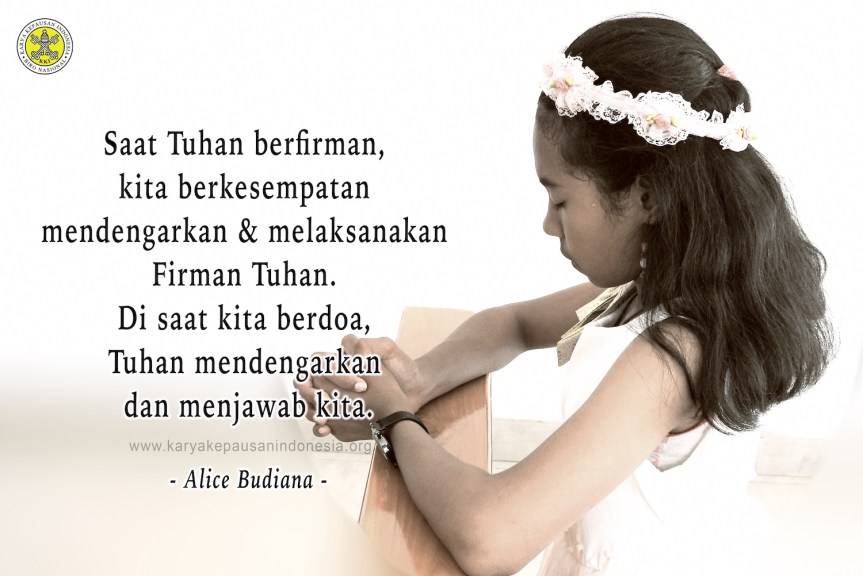 Firman dan doa merupakan sebuah kesatuan yang tidak terpisahkan. Saat Tuhan berfirman, kita diberi kesempatan untuk mendengarkan Firman Tuhan dan melaksanakannya. Dan di saat kita berdoa, Tuhan mendengarkan dan menjawab doa kita.