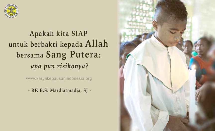 Refleksi: sejauh manakah kita takut sekali pada bahaya manusiawi dan sejauh manakah kita percaya kepada Penyelenggaraan Ilahi? Apakah kita SIAP untuk berbakti kepada Allah bersama Sang Putera: apa pun risikonya?