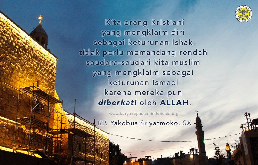 Kedua, dalam rangka dialog antar agama, kita orang Kristiani yang mengklaim diri sebagai keturunan Ishak tidak perlu memandang rendah saudara-saudari kita muslim yang mengklaim sebagai keturunan Ismael karena mereka pun diberkati oleh Allah. Kita ini sama-sama keturunan Abraham maka kita mesti bersatu. Kalau kita bisa hidup saling menghargai, kita akan mampu bekerjasama untuk bersama-sama menghadirkan Kerajaan Allah di dunia ini, khususnya di daerah di mana kita berada.