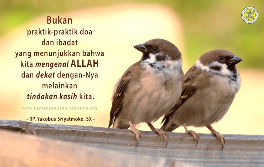 Permenungan kita hari ini membuat kita berintrospeksi diri. Kadang-kadang kita berpikir seperti orang-orang Farisi bahwa kita ini lebih baik dibandingkan orang-orang lain karena kita lebih banyak berdoa dan menjalankan praktik-praktik rohani. Ternyata bukan praktik-praktik doa dan ibadat yang menunjukkan bahwa kita mengenal Allah dan dekat dengan-Nya melainkan tindakan kasih kita. Kalau dari diri kita mengalir perbuatan-perbuatan kasih, tanpa memamerkan dan menyombongkan diri, orang lain akan melihat bahwa kita mengenal dan dekat dengan Allah. Marilah kita hidup dalam kasih dengan saling mengasihi satu sama lain.
