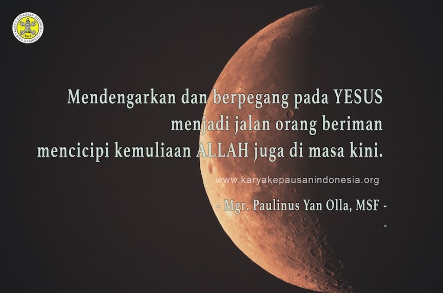 Di masa kini pun ketika iman akan Yesus membawa kita pada salib, kita perlu mengangkat wajah dan memandang dalam iman kita kemuliaan Tuhan yang telah diperlihatkan di atas gunung. Percakapan Yesus di atas gunung dengan Musa dan Elia ingin mengungkapkan bahwa kitab Taurat dan Ajaran para Nabi telah disempurnakan dalam diri Yesus. Mendengarkan dan berpegang pada-Nya menjadi jalan orang beriman mencicipi kemuliaan Allah juga di masa kini.