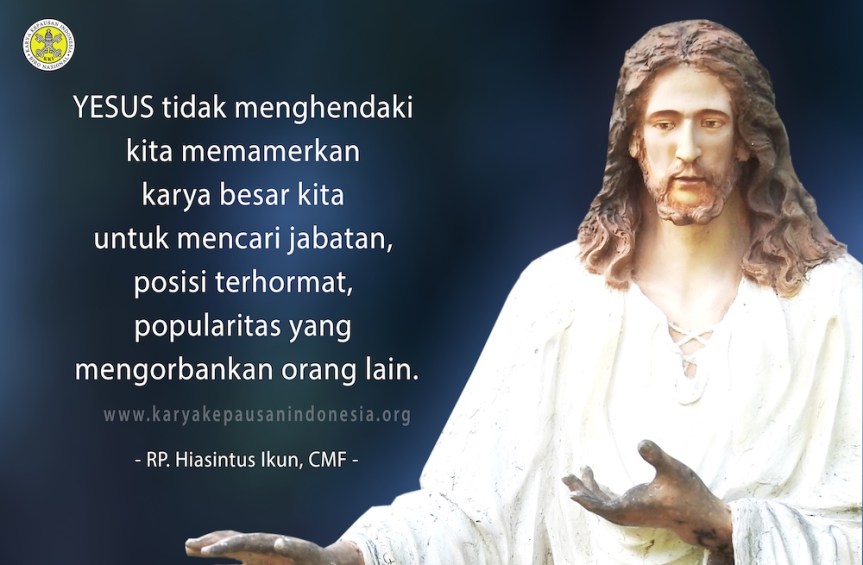 Yesus tidak menghendaki kita memamerkan karya besar kita untuk mencari jabatan, posisi terhormat, popularitas yang mengorbankan orang lain. Tetapi yang dituntut dari kita ialah hadir sebagai seorang sahabat yang melayani dengan rendah hati, lembut hati, penuh kesabaran dan ketabahan, keikhlasan, kejujuran, kebenaran dan kebaikan.