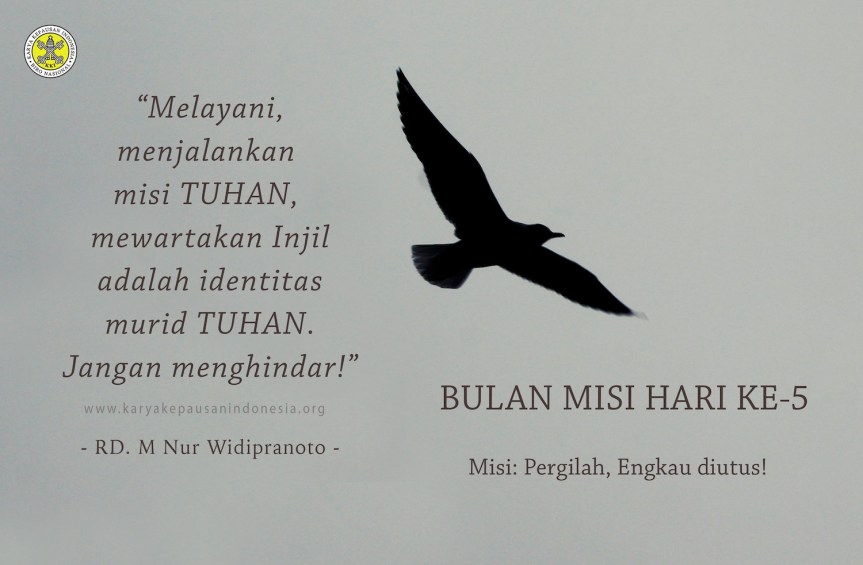 Misi: Marilah kita berani menyediakan diri menjadi alat dan partner Tuhan. Kita siapkan diri mewartakan sukacita Injil dengan kata dan tindakan, dengan percakapan dan kesaksian hidup. (NW)