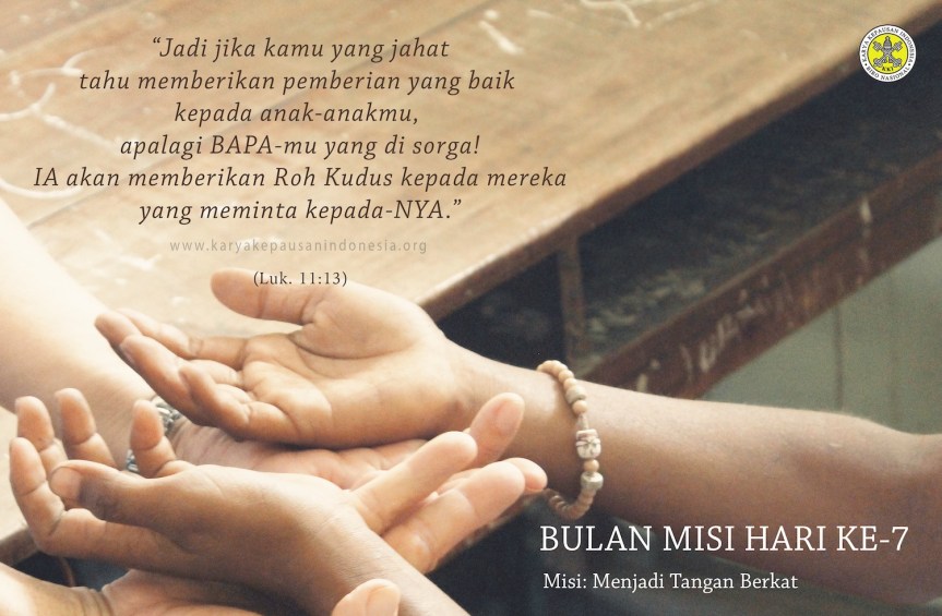“Jadi jika kamu yang jahat tahu memberi pemberian yang baik kepada anak-anakmu, apalagi Bapamu yang di sorga! Ia akan memberikan Roh Kudus kepada mereka yang meminta kepada-Nya.”