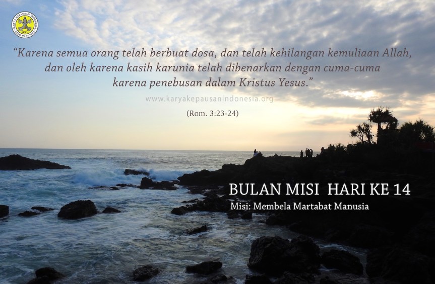 Misi: Sejak semula Allah menciptakan semua baik adanya. Karena dosa, kita terpisah dengan Allah, tapi karena kasih-Nya kita dipulihkan. Kita bersyukur atas anugerah-Nya dan diutus membela martabat yang dikaruniakan-Nya itu. (YH)