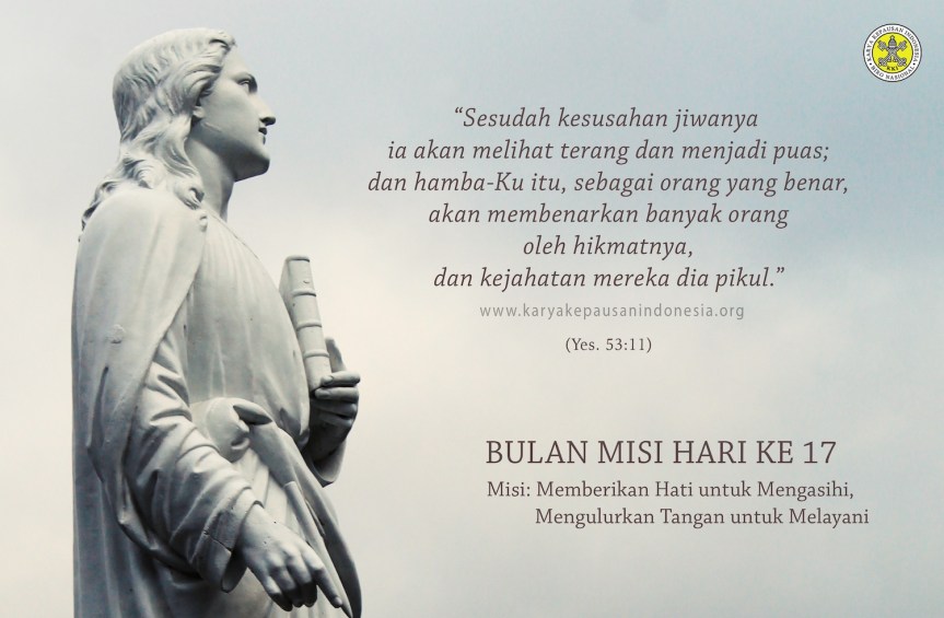 Misi: Dalam kehidupan bersama kasih menjadi dasar hubungan yang harmonis. Kasih ini berasal dari Allah sendiri yang menggerakkan hati setiap orang. Karena kasih yang berasal dari Allah memberikan kebebasan sejati. Maka, marilah kita memberikan hati untuk mengasihi dan mengulurkan tangan untuk melayani. (NW)