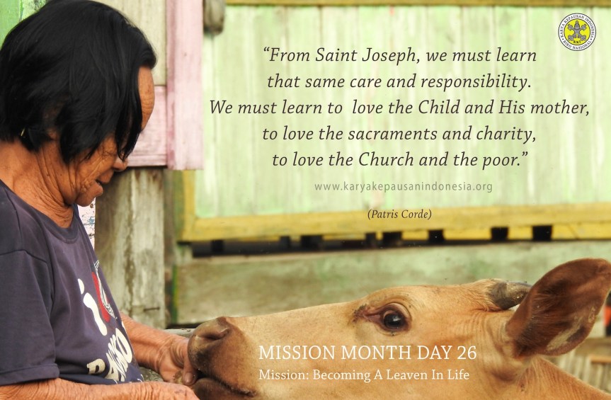 It is said in the Apostolic Letter Patris Corde that Joseph is our role model (as the yeast), as he took the responsibility and care of Mary and Jesus. We too should have the same attitude, to love the sacraments and charity, to love the Church, and to serve and love the poor.
