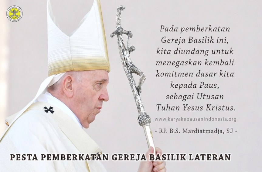 Lambang penting yang disebutkan Yohanes adalah “YERUSALEM DENGAN KENISAHNYA”,- bukan karena gedungnya, bukan karena peran politisnya, bukan karena tuanya,- melainkan karena di dalamnya ada BAIT – SUCI. Hal itu penting justru karena juga dikaitkan dengan ‘kepentingan-kepentingan ekonomis, seperti perdagangan binatang dan uang’. Oleh sebab itu, bagi Perayaan Pemberkatan Basilika Lateran ini perlulah disadari: bukanlah ritus dan lambang-lambang kultural, yang harus kita junjung tinggi, melainkan karena dalam Basilika ini Paus kita hadir sebagai Pemuka Gereja Katolik Roma, yang meneruskan peran Petrus, yang dalam Yoh. 21: 16-20 diberi pesan “Gembalakanlah domba-dombaku”. Kalau pada hari ini kita merayakan pemberkatan Basilik ini, maka kita diundang untuk menegaskan kembali komitmen dasar kita kepada Paus, sebagai Utusan Tuhan Yesus Kristus: jangan mengikuti sementara orang yang meremehkan Paus atau rekan-rekannya para Uskup, melainkan memandang Sang Putera Allah, yang dalam pesan terakhirnya dalam Injil Yohanes menugasi Petrus dan pengganti-pengganti-Nya: “Gembalakanlah domba-dombaKu”. Di akhir renungan ini: marilah kita membaharui Syahadat para Rasul.