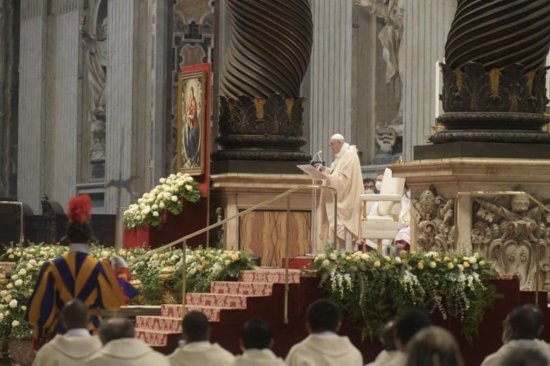 Maka, marilah kita bercermin pada gambaran pertama: Yesus yang datang dengan awan-awan. Gambaran itu membangkitkan kedatangan Kristus dalam kemuliaan di akhir zaman; gambaran itu membuat kita menyadari bahwa kata terakhir dalam hidup kita adalah milik Yesus, bukan milik kita. Ia adalah – demikian Kitab Suci memberitahu kita – yang “yang berkendaraan melintasi awan-awan” (Mzm 68:5), yang kekuasaan-Nya di dalam awan-awan (bdk. Mzm 68:35). Ia adalah Tuhan, matahari yang terbit dari tempat tinggi dan tidak pernah terbenam, Ia yang bertahan sementara segala sesuatu yang lain berlalu, harapan kita yang pasti dan kekal. Ia adalah Tuhan. Nubuat harapan ini menerangi malam-malam kita. Nubuat harapan ini memberitahu kita bahwa Allah memang datang, Ia hadir dan berkarya, menuntun sejarah kita menuju diri-Nya, menuju segenap kebaikan. Ia datang “dengan awan-awan” untuk meyakinkan kita. Seolah-olah mengatakan: “Aku tidak akan meninggalkanmu sendirian saat badai melanda hidupmu. Aku selalu bersamamu. Aku datang untuk membawa kembali langit yang cerah”.