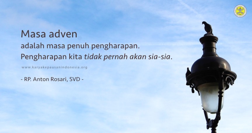 Masa adven adalah masa penuh pengharapan. Pengharapan kita tidak pernah akan sia-sia. Ia mempunyai dasar yang kuat. Di masa lalu Allah telah menyertai umat Israel dengan dengan pelbagai cara: menuntun bangsa Israel keluar dari Mesir, menyertai mereka dengan tiang awan di siang hari dan tiang api pada malam hari, memberi mereka makan manna, memberi mereka minum air dari bukit batu. Demikian juga Allah, dalam diri Yesus, telah membuat sekian banyak mukjizat untuk menyelamatkan umat-Nya.
