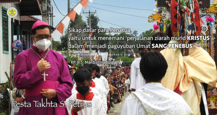 1Ptr. 5:1-4: yang dihidangkan untuk bacaan pertama, juga menunjukkan, bagaimana Petrus menyadari tugasnya sebagai ‘sekadar penatua’, artinya ‘yang dituakan dalam persekutuan para murid Kristus’. Hal itu bergema pada masa kini, ketika Paus Fransiskus menempatkan dirinya sebagai rekan sepelayanan dengan para Uskup. Bacaan dalam surat Petrus, yang dipetik hari ini secara jelas menekankan sikap dasar para Penatua, yaitu untuk menemani ‘perjalanan ziarah murid Kristus’ dalam ‘menjadi paguyuban Umat Sang Penebus’. Hal itu dapat menjadi ajakan bagi mereka, yang sekarang ini mengambil bagian dalam pelayanan jemaat untuk “menjadi rekan berjalan bersama para Murid Kristus”. Untuk itulah kita boleh memperhatikan ajakan Paus Fransiskus, yang belum lama ini mengajak semua Uskup sedunia untuk membimbing umat, guna terlibat dalam “menyadari ziarah bersama mengikuti jejak Kristus” dalam menjalani “jalan bersama”, yang diberi judul “Synode Universal Gereja, yang diharapkan melibatkan seluruh umat sampai dua tahun mendatang”. Betapa Pengganti Petrus di masa kini mengenakan juga semangat Petrus dalam “menduduki tempat pelayanan Petrus sebagai Penatua Paguyuban Umat Beriman”. Harapannya adalah “bila Sang Gembala Agung tiba, maka keselamatan hadir dalam Gereja”. Demikianlah kita diajak mendoakan Pengganti Petrus dalam Peringatan Hari ini.