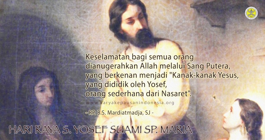 SANTO YOSEF: Sangatlah umum dikatakan di kalangan kita, bahwa anak itu “karunia Allah”. Bapak-Ibu memang menjadi partner dari Allah dalam melaksanakan Penciptaan tanpa henti. ‘Exhortatio FAMILIARIS CONSORTIO’ ditulis oleh Seri Paus untuk menggarisbawahi sikap iman itu: bahwa Allah mengikutsertakan “orang tua” untuk menghadirkan Penciptaan di masa sekarang. Lebih lanjut, orang tua ditugaskan untuk menjadi “pendidik utama” dari “orang muda” yang disambutnya dalam Keluarga. Pada waktu dikunjungi Malaikat Gabriel, Perawan Maria dipercaya untuk menjadi Bunda Sang Putera, yang sudi menjadi Puteranya, yang dilahirkan Bunda Maria. Pesta St. Yosef adalah Momentum penting yang dipilih oleh Gereja, untuk melanjutkan peringatan Penjelmaan Allah Putera di Keluarga Nasaret. Sebab, menurut Filipi 2:5-11 jelas bahwa Allah Putera mengosongkan Diri menjadi manusia: dan itu terjadi dalam Keluarga Nasaret. Untuk itulah mengapa Yosef ditugaskan untuk mendampingi Bunda Yesus: supaya “membesarkan dan mendidik Kanak-kanak Yesus”. Kita boleh berterima kasih kepada Allah bahwa memilih Yosef; kita juga seyogianya bersyukur, bahwa Yosef menyediakan diri untuk mengambil bagian dalam mendampingi Sang Putera, merendahkan Diri dan mau menyatukan Diri dengan Keluarga Kudus Nasaret. Sebagai Keluarga yang mewarisi Tradisi Abraham-Ishak-Yakub, mereka harus menjalankan kebiasaan berbincang-bincang, berdoa bersama, berunding mengenai caranya melaksanakan Liturgi Yahudi: dari yang paling agung, seperti Paskah, sampai yang paling sederhana, dalam setiap kesibukan kekeluargaan sehari-hari. Sebab, sebagai generasi baru, Kanak-kanak Yesus membutuhkan ‘pelajaran dan pendidikan’, bagaimana tumbuh sebagai keturunan Yakub dan mempelajari pesan-pesan Musa serta menggumuli liturgi harian.