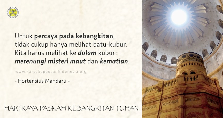 First, run. The experience of Easter, no matter how shallow and short time, it has aroused the enthusiasm of proclamation. Look at Mary of Magdala. Just looking at the removed tomb’s stone, she ran away. Not running to hide, but instead to tell Peter and the disciple whom Jesus loved. Unfortunately, her message was filled too much filled by her emotion: “They have taken the Lord from the tomb”. She still considered Jesus as a corpse that could be taken and removed by humans. Mary of Magdala’s first reaction displayed a human faithless response to the resurrection: Jesus’ body was stolen and moved from the tomb. That was also the reaction and propaganda of the Jewish chief priests from the beginning (cf. Mat. 28:11-15), as well as the thinking of some people until now. Two men ran together as well to the empty tomb. Peter ran less fast than the other disciple, maybe due to Peter’s older age. Anyway, in general, he who loves will be more enthusiastic in seeking the Beloved.