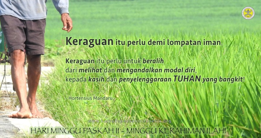 Apa yang salah dengan Tomas? Apa yang tidak betul dengan keraguan dalam beriman? Justru hari ini Saya dan Anda diajarkan Tomas tentang salah satu tahap hakiki dalam beriman, yaitu: keraguan! Itu bukan gejala baru. Panggilan dan kisah Abraham, Sara, Musa, Ayub, Yeremia, Umat Israel, dll, dalam PL selalu saja disertai keraguan. Mengapa? Karena tugas dan perutusan Allah sering tidak masuk akal dan hitungan manusia. Itulah pesan pertama: keraguan itu perlu demi lompatan iman. Keraguan itu perlu untuk beralih dari melihat dan mengandalkan modal diri, kepada kasih dan penyelenggaraan Tuhan yang bangkit! Keraguan awal itulah yang justru akhirnya menuntun Tomas untuk sampai pada pengakuan yang paling mulia tentang Yesus: “Ya Tuhanku dan Allahku”. Dari mulut si Peragu, keluarlah ucapan teragung tentang Yesus sebagai “Pewahyu Allah”: dengan melihat Yesus, manusia dapat melihat Allah sendiri. Pribadi, karya dan ajaran-Nya menghadirkan Allah secara penuh dan lengkap bagi manusia yang percaya.
