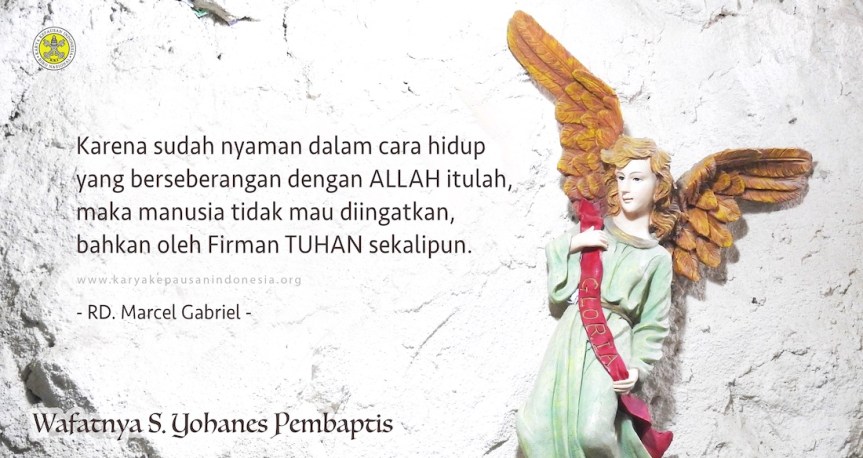 Para pewarta keadian dan kasih Allah sering berada di antara kehendak dan rancangan Allah dengan kehendak dan rancangan manusia, yang tidak selalu sejalan atau “in line” seperi dalam kasus Herodes dan Herodias ini. Dan dalam situasi seperti ini, di mana hanya ada satu dari dua alternatif piihan yang ada, pilihan para utusan Allah seperti Yohanes Pembaptis ini adalah tetap setia kepada rancangan Allah, tetap menyuarakan kehendak Allah. Santo Yohanes Pembaptis, doakanlah kami supaya dalam situasi hidup apapun yang kami hadapi, kami tetap mengutamakan Allah dan rancangan serta kehendak-Nya. Amin!