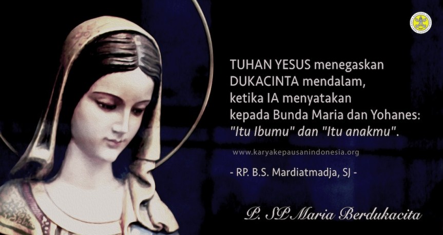 REFLEKSI KITA: seberapa banyak kita sudah menerima Kebaikan-Nya? Di Golgota, kita menyaksikan, bagaimana Tuhan Yesus menegaskan DUKACINTA mendalam, ketika Ia menyatakan kepada Bunda Maria dan Yohanes: “Itu Ibumu” dan “Itu anakmu”. Jangan lupa: itu di bawah salib. DUKACINTA MENDALAM. Itulah yang kita kenangkan dalam hari ini. Sementara ini, seberapa sering kita menghibur Bunda Maria? Dengan cara apa? Marilah berdoa: “Salam Maria …..”