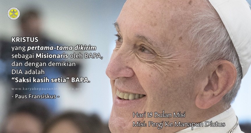 Pesan Paus pada Hari Misi Sedunia 2022: Kristus yang pertama-tama dikirim sebagai Misionaris oleh Bapa (bdk. Yoh. 20:21), dan dengan demikian Dia adalah “Saksi kasih setia” Bapa (lih. Why. 1:5). Dengan cara yang sama setiap orang Kristiani dipanggil untuk menjadi seorang misionaris dan saksi Kristus.