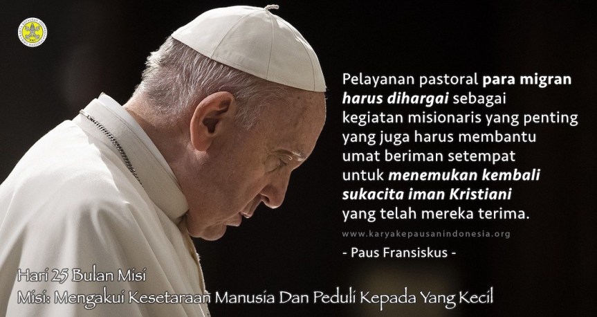 Paus Fransiskus selalu memberikan perhatian lebih kepada para migran atau pengungsi. Mengapa? Karena menurutnya kita semua adalah pengungsi. Yesus pun adalah pengungsi. Dari sejak dikandung di dalam rahim Maria, Yesus telah dipaksa mengungsi dari tanah tempat kaumnya berada. Paus Fransiskus dalam pesannya untuk Hari Misi Sedunia 2022 mengingatkan, Pelayanan pastoral para migran harus dihargai sebagai kegiatan misionaris yang penting yang juga harus membantu umat beriman setempat untuk menemukan kembali sukacita iman Kristen yang telah mereka terima.