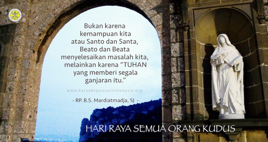 Santo berasal dari kata Latin, ‘Sancire’, yang berarti menguduskan. Dengan ungkapan itu mau dikatakan bahwa yang disebut Santo atau Santa adalah “mereka yang dikuduskan oleh Yang Mahakudus”. Beato atau Beata adalah mereka yang dibahagiakan oleh Yang Mahabahagia di surga. Maka semua para Kudus dan Beato kita hormati bukan karena mukjizat mereka (sehingga mungkin sesuatu masalah dalam diri atau keluarga atau komunitas atau masyarakat kita terselesaikan), tetapi makna utamanya adalah karena Karunia Allah menguduskan dan membahagiakan. JADI YANG KITA RAYAKAN ADALAH “tindakan Yang Mahakudus”. Maka Pelaku Utamanya adalah Roh Allah, yang menguduskan semua murid Kristus, terutama, yang mendengarkan Sang Putra, hidup sesuai dengan ajaran-Nya serta memberikan “tanda dan sarana”, bahwa sampai nafas terakhir pun, tetap setia mengarahkan hati kepada Allah Bapa. Arah perhatian hati kita, yang merayakan hari Para Kudus, adalah (seperti ditulis Why. 7:2-4.9-14): yaitu “Allah telah menguduskan dan membahagiakan mereka dari segala bangsa dan suku, kaum dan bahasa”. Mereka itu semua “dimateraikan maupun disapa oleh para malaikat sebagai tak terhitung jumlahnya”. Semua “yang dikuduskan oleh Roh Allah” itu memuji Allah tanpa henti. Selayaknya kalau kita mengarahkan hati kita kepada Bapa, pada Hari Pesta para Kudus ini.