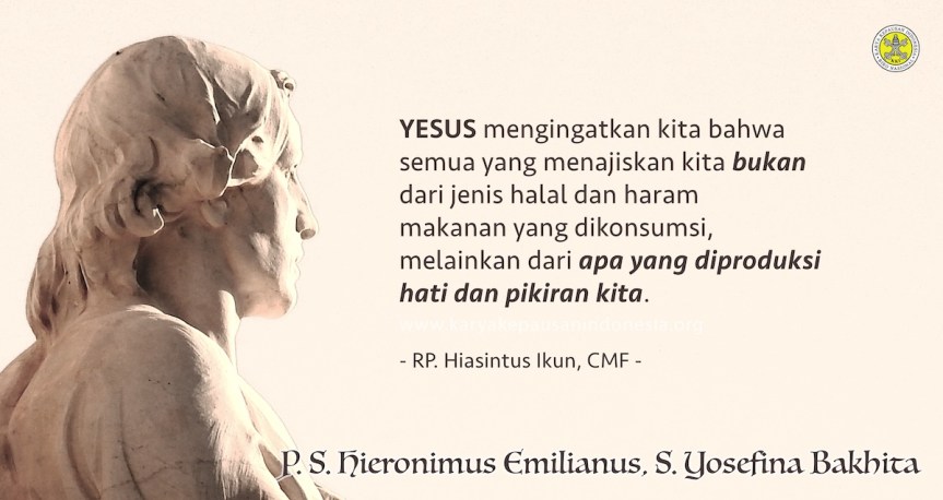 Sementara Gaung Sabda Tuhan dalam Injil hari ini berkisah tentang halal tidaknya sesuatu yang masuk ke dalam tubuh manusia. Yesus mau menjamin bahwa semua yang datang dari luar tubuh manusia tidak dapat menajiskan manusia. Bagi Yesus, sesuatu yang menajiskan manusia selalu datang dari dalam diri manusia. Yesus justru langsung menyebut bahwa HATI MANUNSIA merupakan bagian terdalam dari pribadi manunsia yang mampu mengelolah kebaikan dan kejahatan.